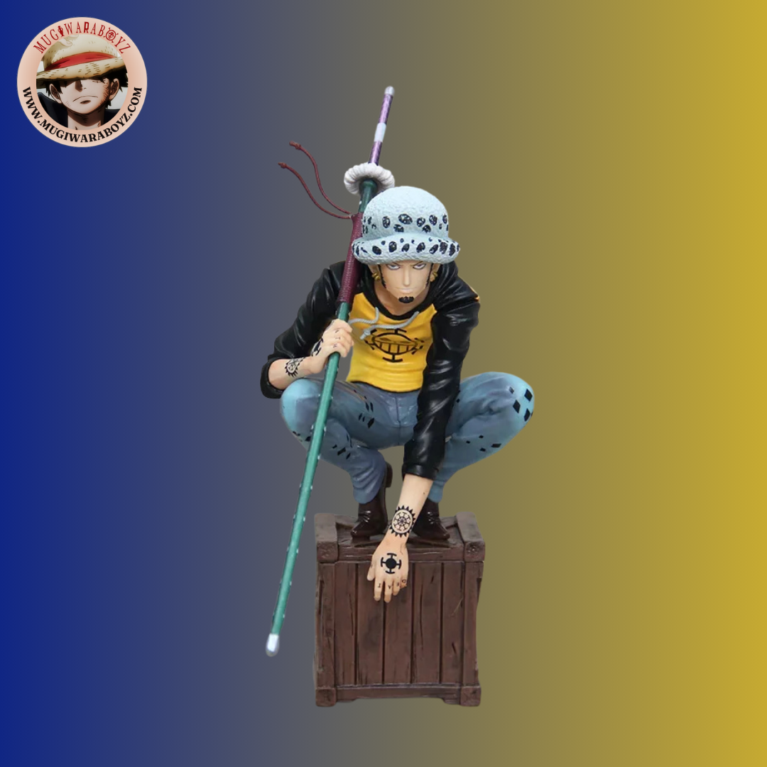 Découvrez Trafalgar D. Water Law, le célèbre Chirurgien de la Mort, dans une pose emblématique accroupie sur une caisse, reflétant parfaitement son calme, sa stratégie et son charisme légendaire dans l’univers de One Piece.