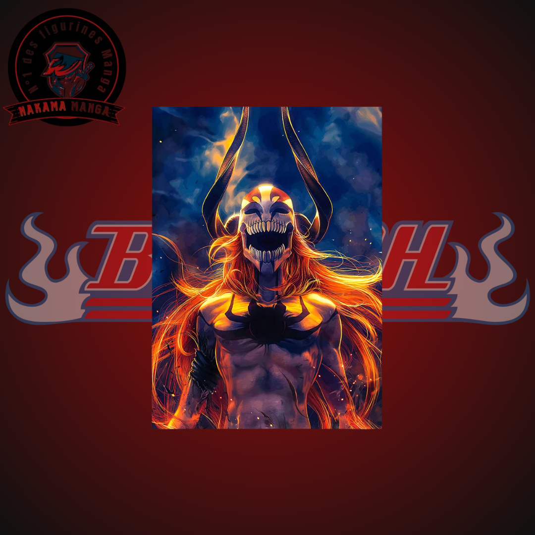 • Design intense et transformé : Ichigo dans sa forme Arrancar — demi-masque Hollow brisé, aura sombre rouge et noire tourbillonnante, sabre Zangetsu en pleine charge, avec fond chaotique parsemé de flammes spirituelles et de brume bleutée.