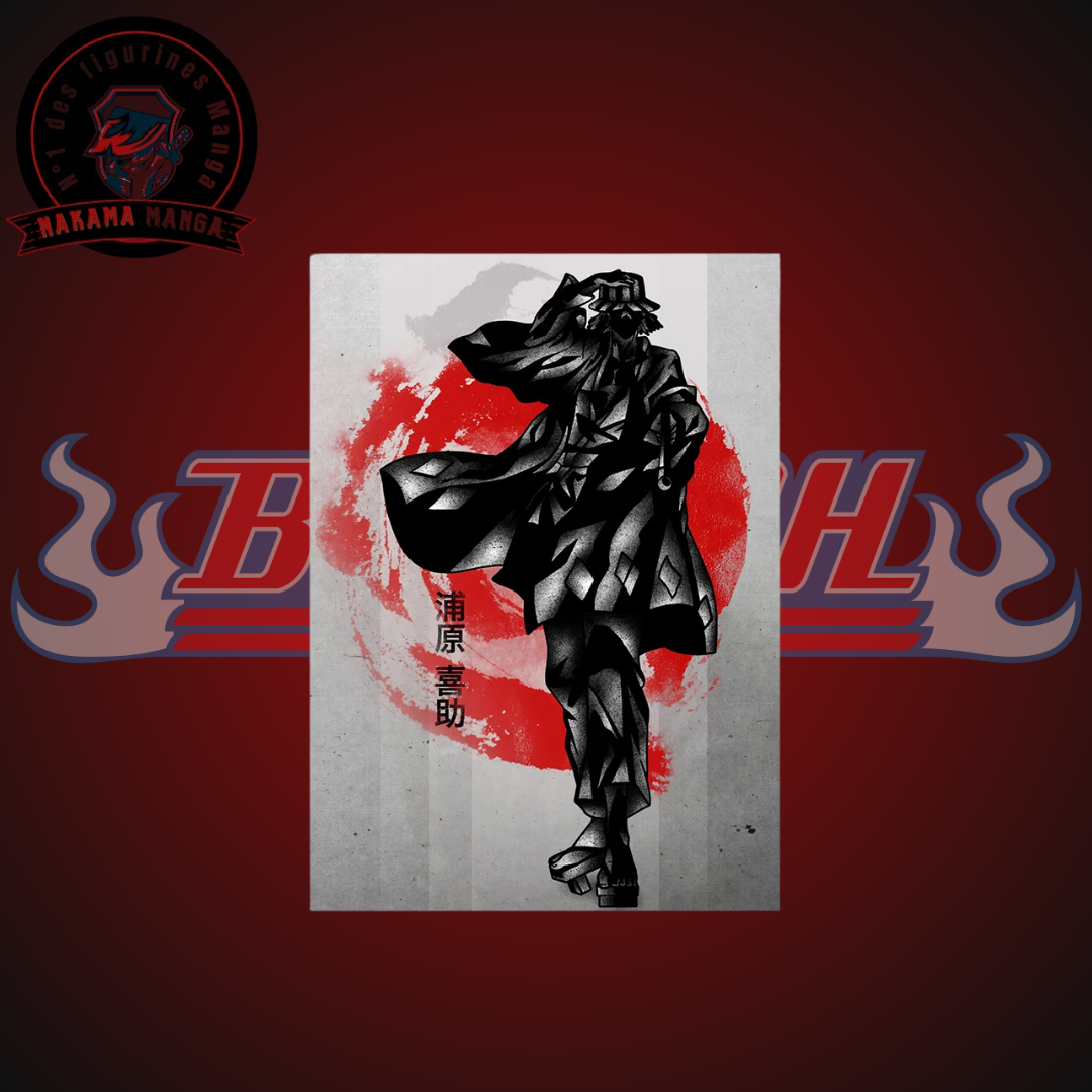 • Design mystérieux et stylisé : Urahara dans sa posture énigmatique — chapeau enfoncé, éventail déployé, sabre Benihime partiellement dégainé. Fond vert sombre entre laboratoire et spiritualité, traversé de motifs alchimiques et éclats rouges qui évoquent son intellect et sa puissance cachée.