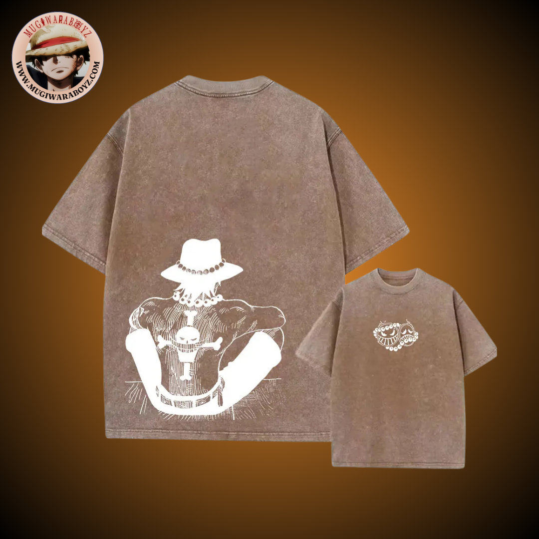 • Dos — Ace de dos : Illustration sobre mais puissante de Ace vu de dos, avec son tatouage “ASCE” bien en évidence, son dos musclé, le chapeau incliné, et un effet de flammes discrètes qui émergent du bas de l’image. Un hommage à sa silhouette légendaire, capturée dans un style semi-réaliste et manga.