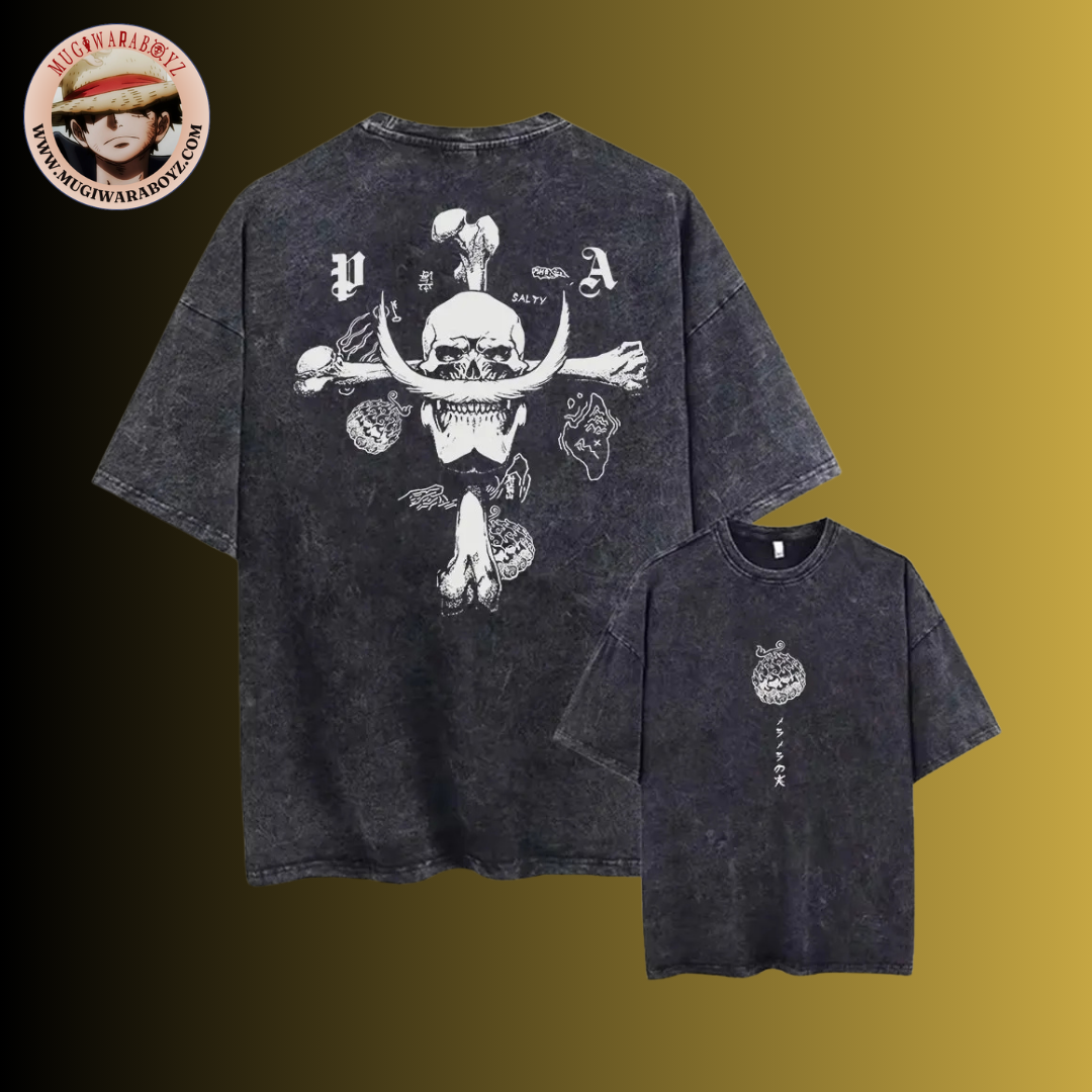 • Dos — L'emblème de Barbe Blanche : Le symbole légendaire de l’équipage de Barbe Blanche — le crâne avec moustache et les os croisés derrière — en grand format centré sur le dos. Peut être légèrement patiné pour un effet rétro, ou en blanc éclatant pour contraster avec le tissu.