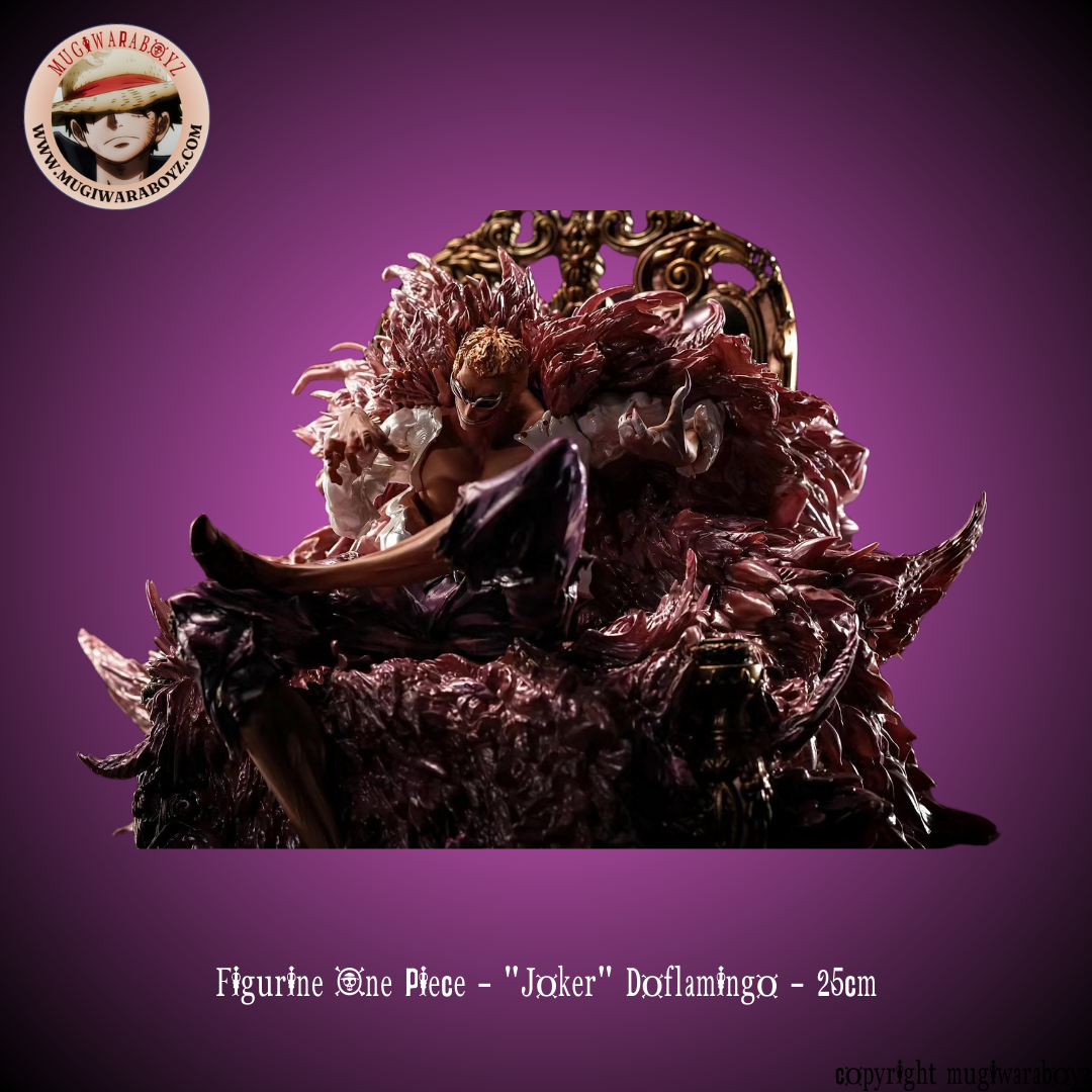 Cette figurine représente Doflamingo assis sur un trône imposant, dans une posture royale et décontractée. Son regard est froid et calculateur, accompagné de son sourire malicieux, qui exprime toute sa cruauté. Il porte son manteau de plumes roses qui s'étend élégamment autour de lui.