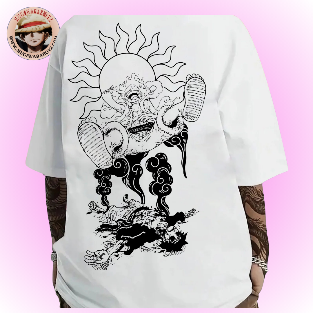 • Dos — Luffy en Gear 5 : Illustration spectaculaire de Monkey D. Luffy dans sa transformation Gear 5, vu de dos en pleine action ou dans une pose décontractée typique de Nika. Cheveux vaporeux, silhouette bondissante, sourire légendaire, éclairs stylisés autour du corps. Un rendu dynamique qui donne l’impression que la liberté incarnée te suit à chaque pas.